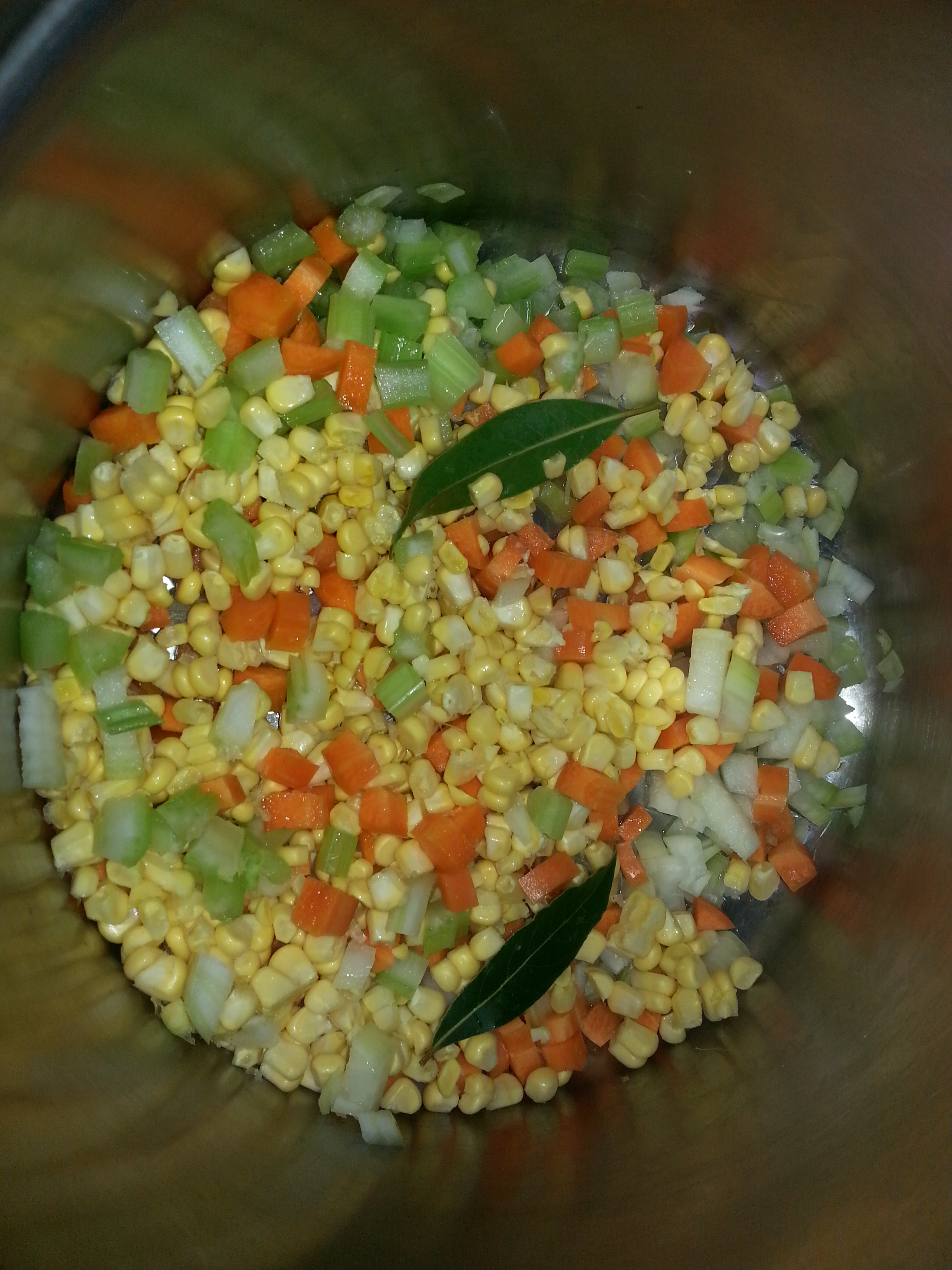 Prepare the vegetable base for the soup. For this, brown onion, carrot and celery are diced into approximately 1 cm cubes. In culinary terms, this is called a mirepoix.  Remember, the larger the surface area you create, the more flavour that will be extracted. I am also adding raw corn kernels to this base. Season.
