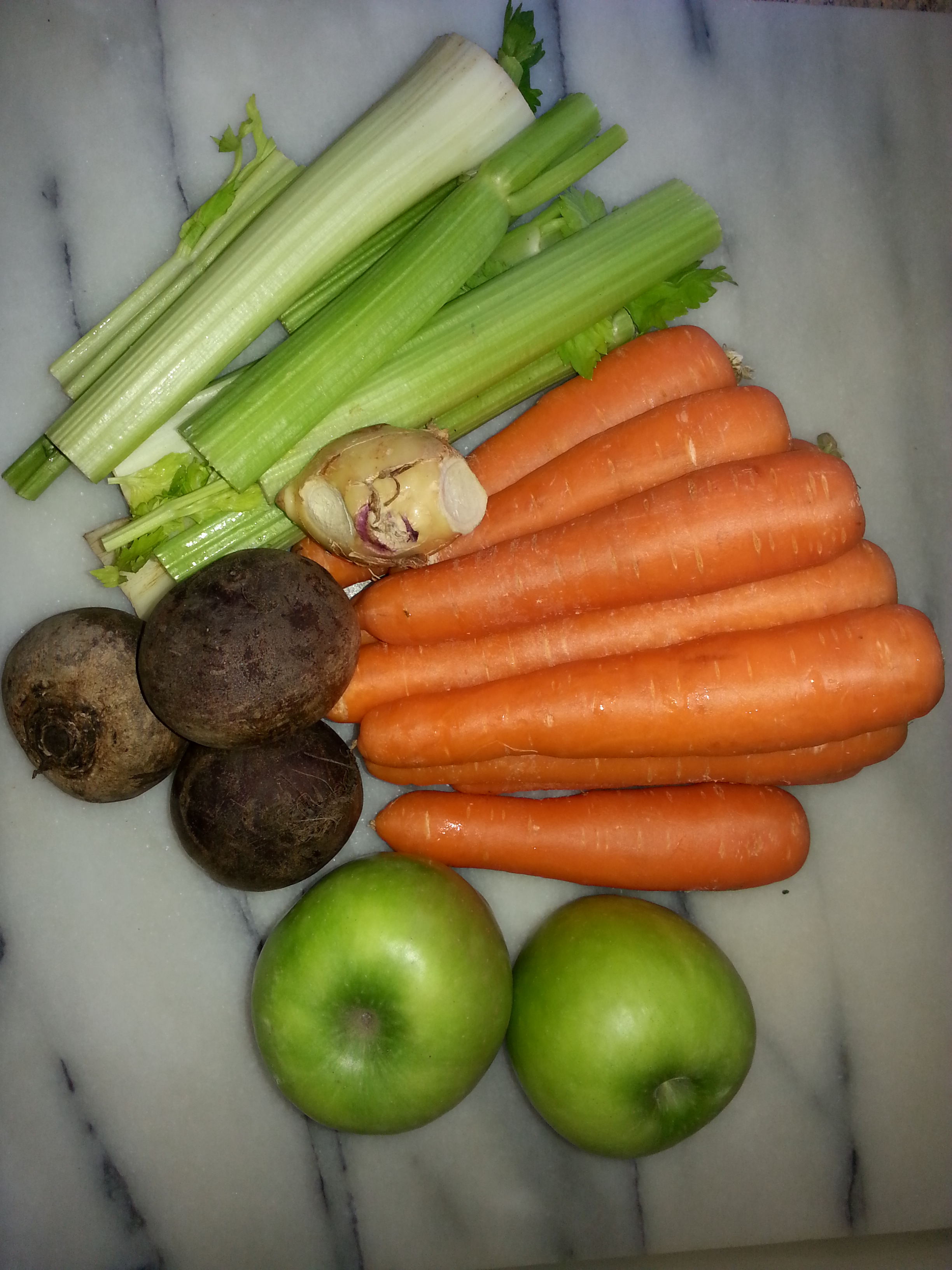 What better way to start the recipe section than with a juice. Each day I drink about 500 ml of freshly squeezed juice, using an old-fashioned centrifugal juicer. Not quite cold-pressing or shooting Nutra-bullets yet. The base of all my juices is a majority mix of carrots and celery, then beetroot and ginger. Here I’ve thrown in two apples from my tree as well. Doing some research, I found this combo to be a winner. And they are easy to grow!